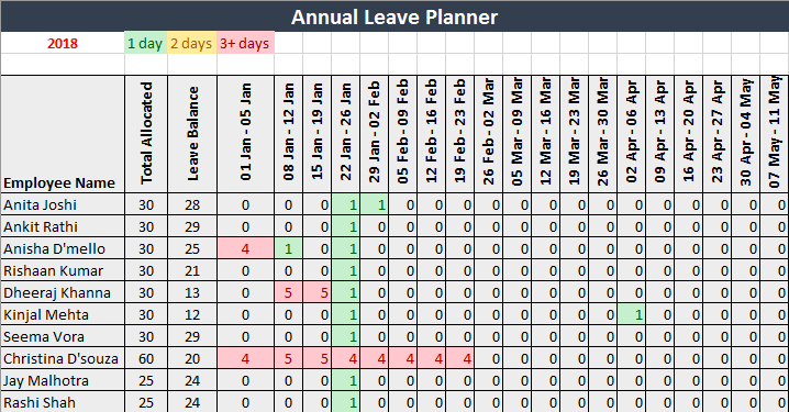 Annual Employee Vacation Planner Template Excel › Employee Leave